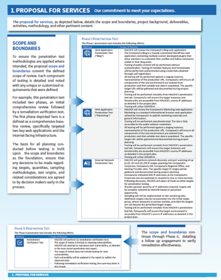 - Scope – Ensure that the scope of the proposed project has been captured accurately, including key information such as the number of IP addresses, testing restrictions (time windows), key delivery dates, any travel requirements, etc. All of these items will usually factor into the price so as the buyer, you want to be sure that the firm correctly scoped the project so that you’re not paying too much and they’re planning to assess your entire scope.