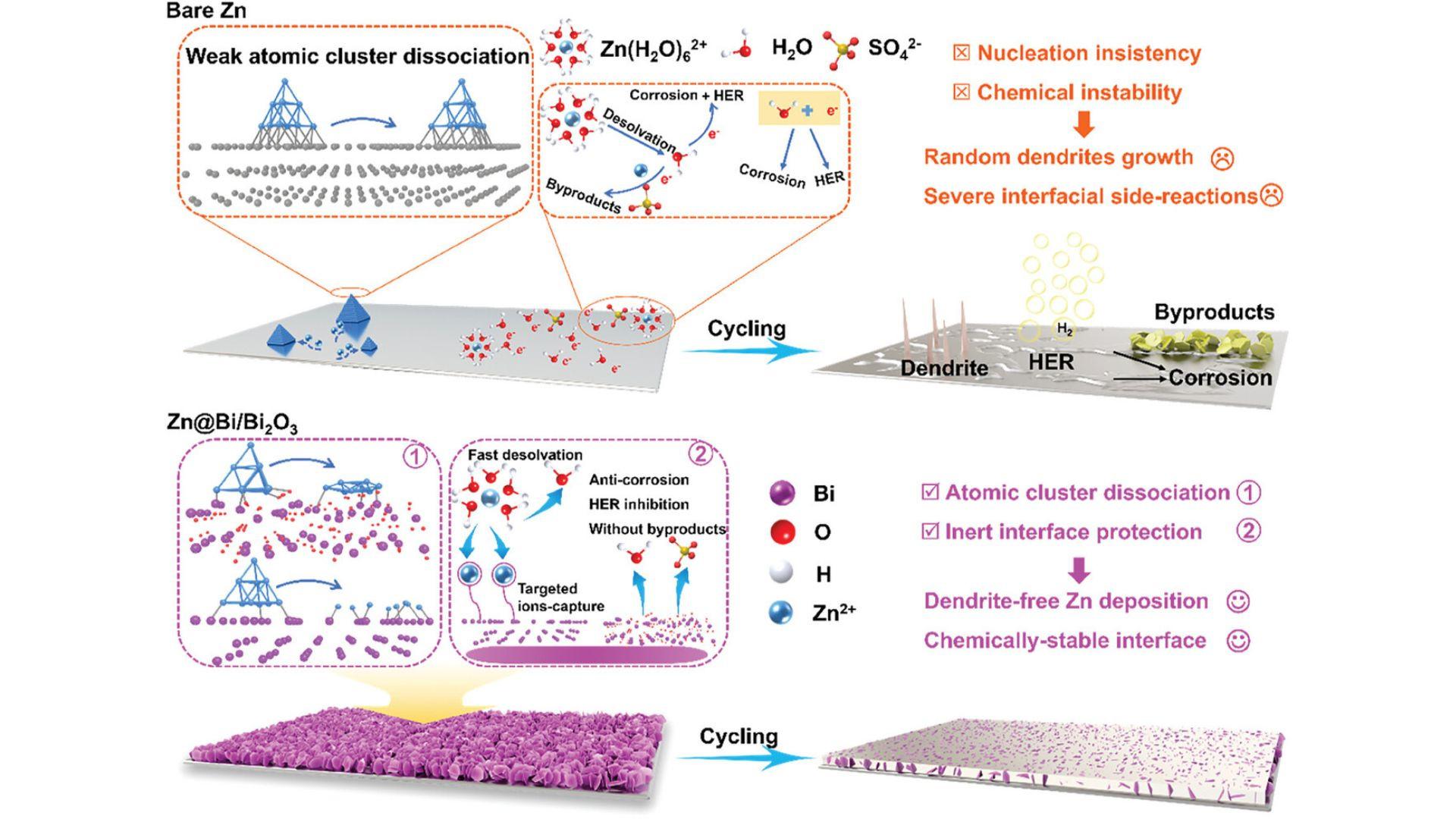 Visual comparison of ion deposition and interface chemistry on bare zinc and zinc coated with bismuth and bismuth oxide during cycling.